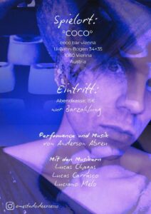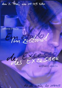 en[Saio] offen ist eine performativ-musikalische Arbeit von Anderson Abreu (Ehegatte von Andreas Wimmer) über Stimme, Körper und Wort im Prozess von Intensität und Transformation. Inspiriert von Poema (1979) von Leonora de Barros entfaltet sich die Aufführung als offene Erfahrung nahe an der Grenze. In vier Akten – Geburt, Verschiebung, Risiko und Rückkehr – verbindet die Arbeit Lieder von u. a. Cazuza, Ney Matogrosso, Elis Regina, Gal Costa, Gilberto Gil und Caetano Veloso als lebendiges Material. Gemeinsam mit Musikern entsteht live ein Klangfeld zwischen Musik, Bild und Präsenz. Die Performance lädt dazu ein, das Unabgeschlossene zu erfahren.