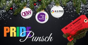 Die AGPRO lädt gemeinsam mit den QBW und Pride Biz Austria zum Weihnachtsumtrunk an den gemeinsamen Punschstand in Wien-Alsergrund. Dort lassen wir zusammen das Jahr ausklingen und freuen uns auf alle Besucher:innen – egal ob Mitglieder, deren Partner und weitere Begleitpersonen, Pride Allys, AGPRO-Friends oder Interessenten. Punsch, antialkoholische Getränke und kleine Speisen gibt es vor Ort gegen freiwillige Spenden.